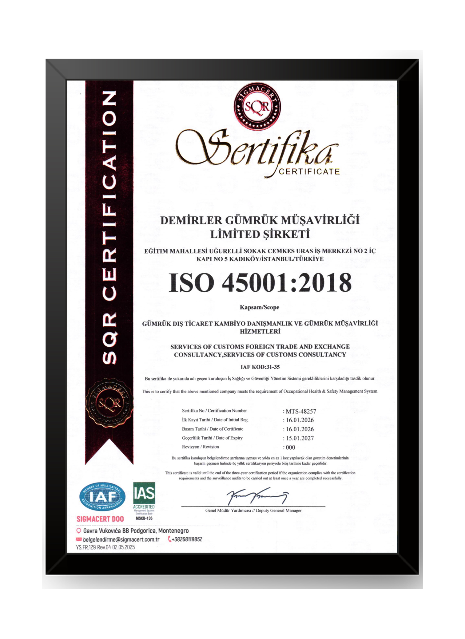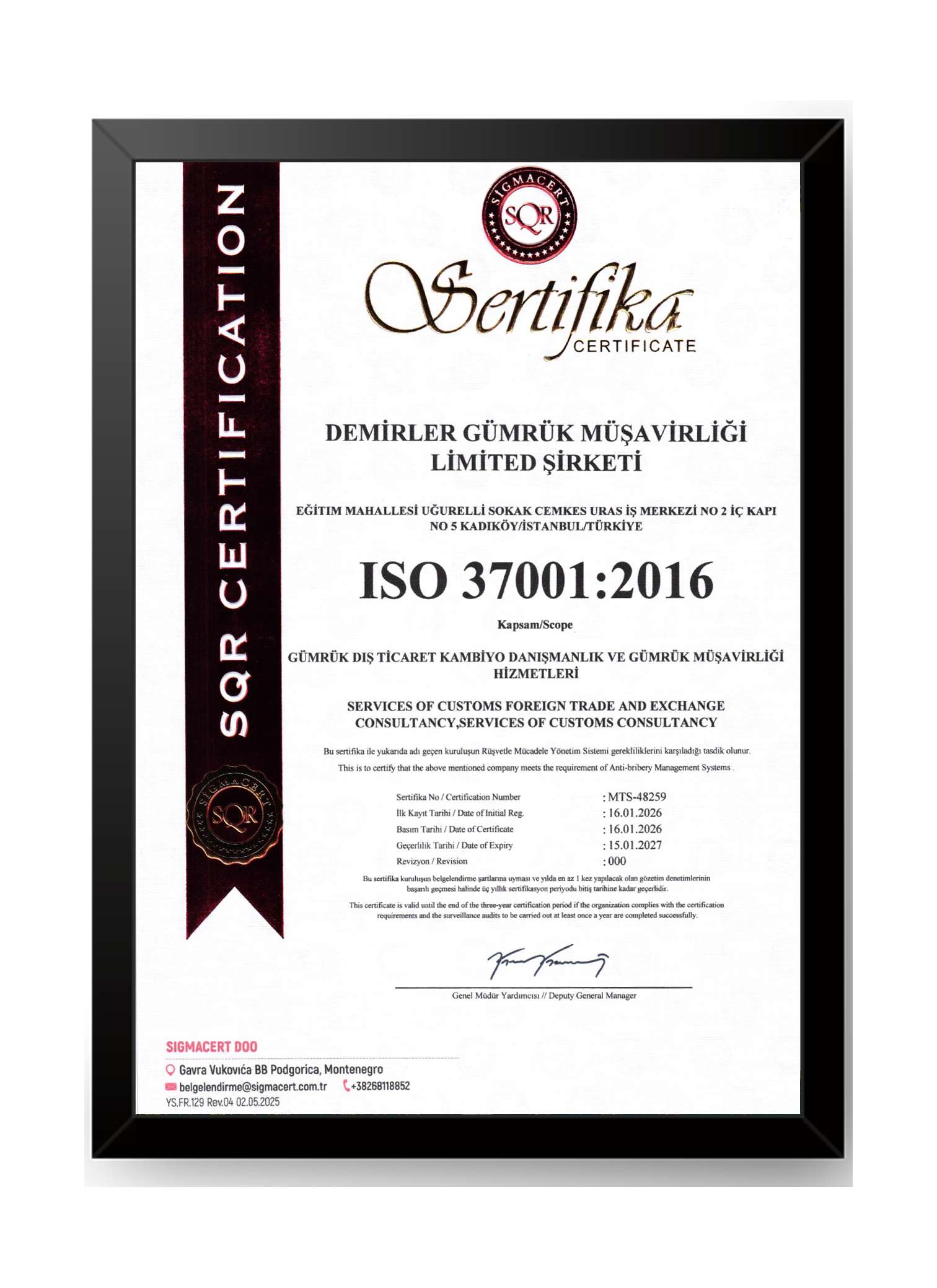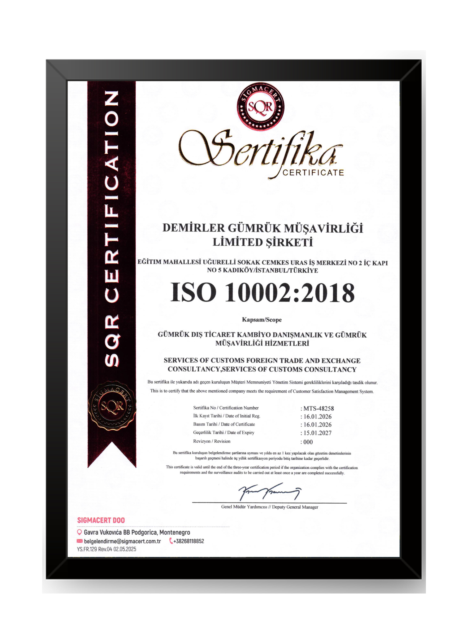 Yasal mevzuat çerçevesinde müşterimize beklentilerinin ötesinde hizmet sunup tüm işlemlerini doğruluk, güven ve çabukluk prensiplerine dayanarak sonuçlandırmak, müşterilerimize hizmet kalitemiz ile rekabet avantajı sağlamak Demir Grup olarak Kalite Politikamızdır.